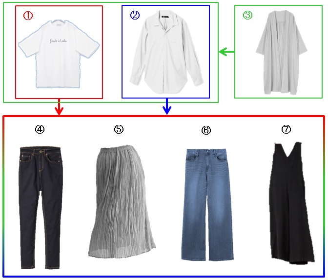 3)①と②をあわせて各ボトムスに合わせる→4パターン