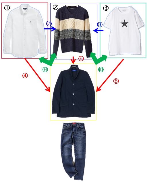 2)④のジャケットに①・②・③其々単体をプラス→3パターン