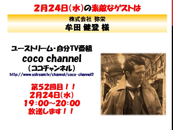 【ツラさをバネに!人との繋がりと感謝の気持ちで世の中を変えたい!/ゲスト㈱弥栄:牟田健登さん】coco channel vol.52 / 2016.2.24