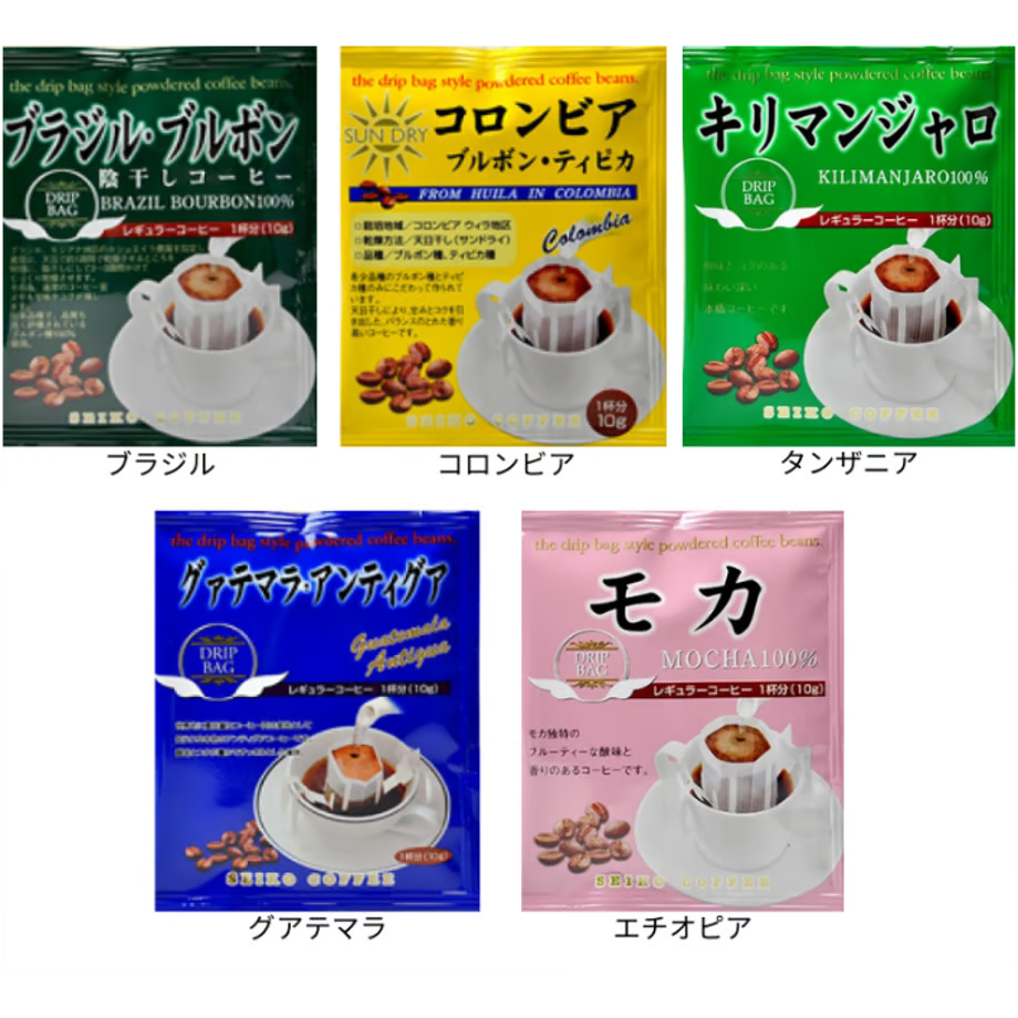 ・ブルボン(ブラジル) ・ブルボン・ティピカ(コロンビア) ・キリマンジャロ(タンザニア) ・アンティグア(グァテマラ) ・モカ(エチオピア)