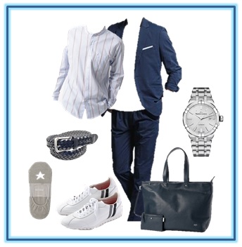 バンドカラーコットンシャツ(ネイビー・ストライプ)